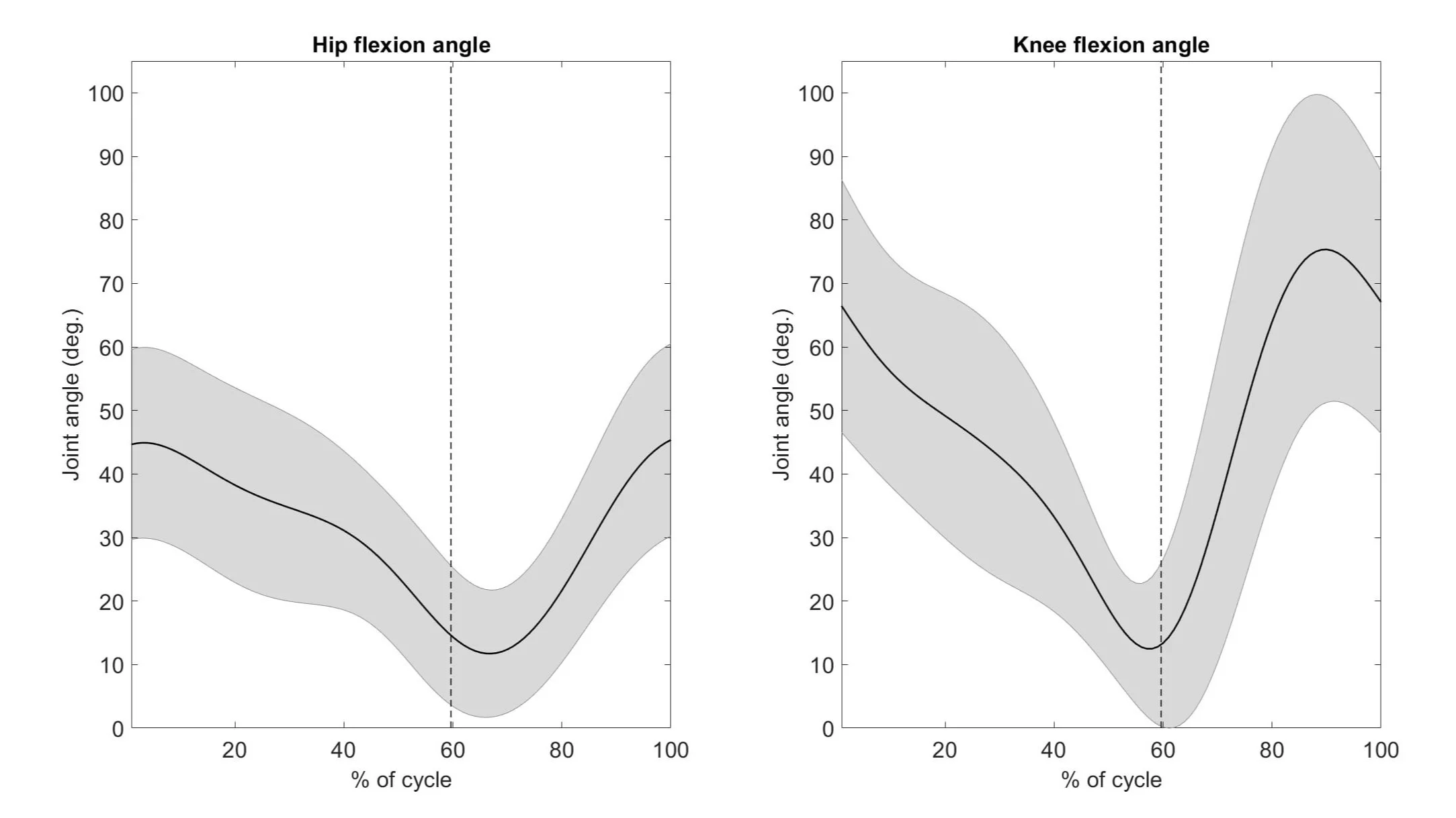 Alla olevassa kuvaajassa (A) havainnollistetaan 8 alaraajan lihaksen keskiarvostetut (n=12) aktiivisuustasot luistelupotkusyklin aikana. Kuva (B) puolestaan esittää polvi- ja lonkkanivelen kulmamuutokset yhden luistelupotkusyklin aikana. Pystysuora katkoviiva kuvastaa työntö- ja palautusvaiheen vaihdoskohtaa (oikea työntövaihe ja vasen palautusvaihe).
